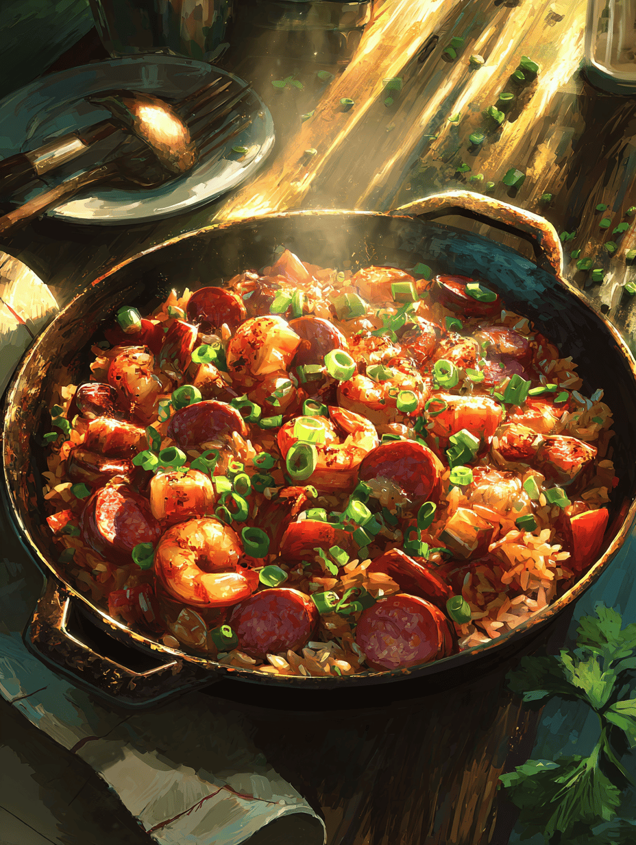 Serve the jambalaya hot, garnished with additional scallions or herbs if desired, and enjoy the hearty, smoky flavors in every spoonful.