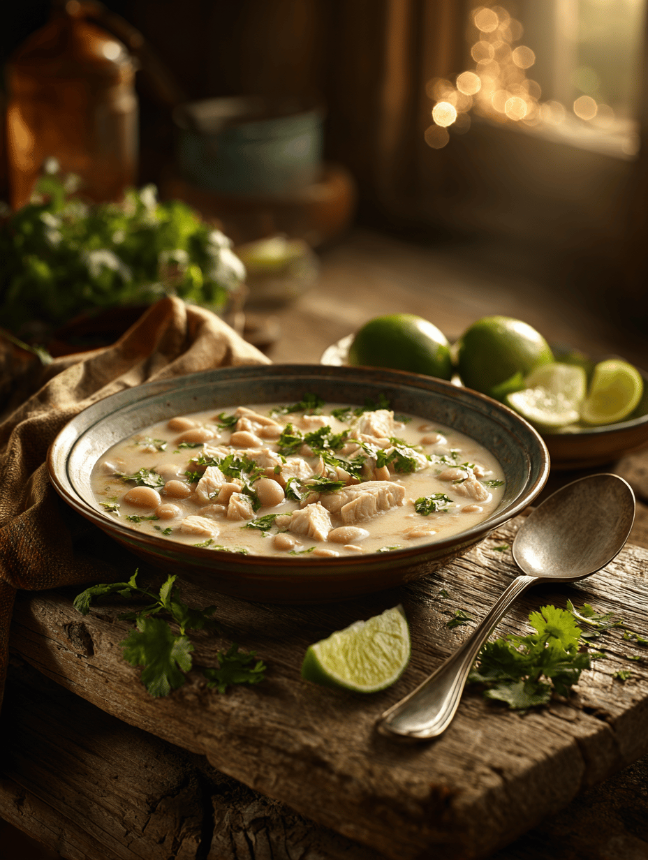 Serve the white chicken chili hot in bowls, garnished with extra cilantro if desired. Enjoy the comforting, spicy, and bright flavors with a side of crusty bread or tortilla chips.