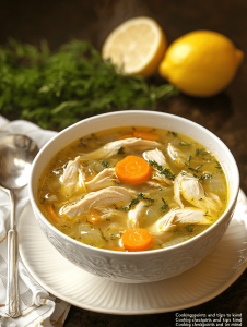 A bright and comforting chicken soup infused with fresh lemon and herbs, featuring tender shredded chicken, crunchy vegetables, and a fragrant broth. The soup is simmered until flavors meld, then finished with a splash of lemon for a lively finish, resulting in a vibrant, hearty dish with a clear broth and tender ingredients.