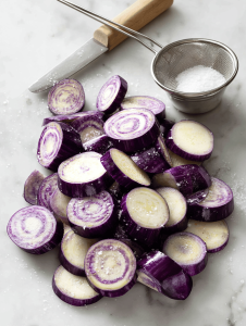 Step 2: Slice the eggplants into 1/2-inch thick rounds. Toss with salt and let sit for 20 minutes to draw out bitterness.