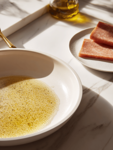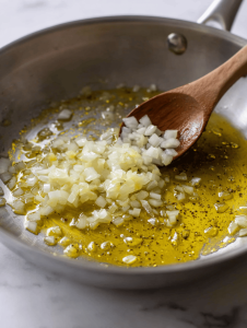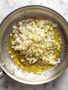 Step 3: While pasta cooks, heat a drizzle of olive oil in a wide skillet over medium heat—about 160°C (320°F).