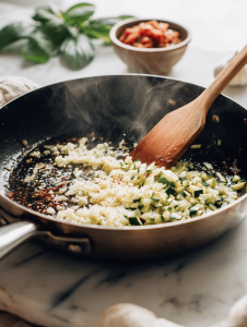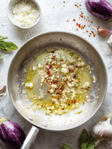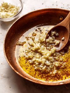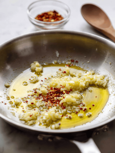 Step 4: Add crushed garlic, a pinch of chili flakes, and cook until fragrant—about 30 seconds.