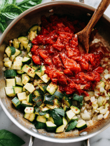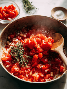 Step 6: Add canned tomatoes, a pinch of sugar, and simmer for 15 minutes, stirring occasionally.