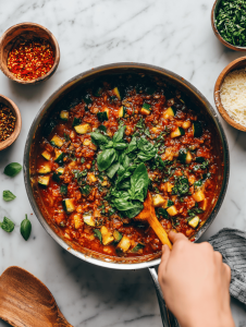 Step 8: Finish with torn basil, a squeeze of lemon, and grated Parmesan—adjust seasoning to taste.